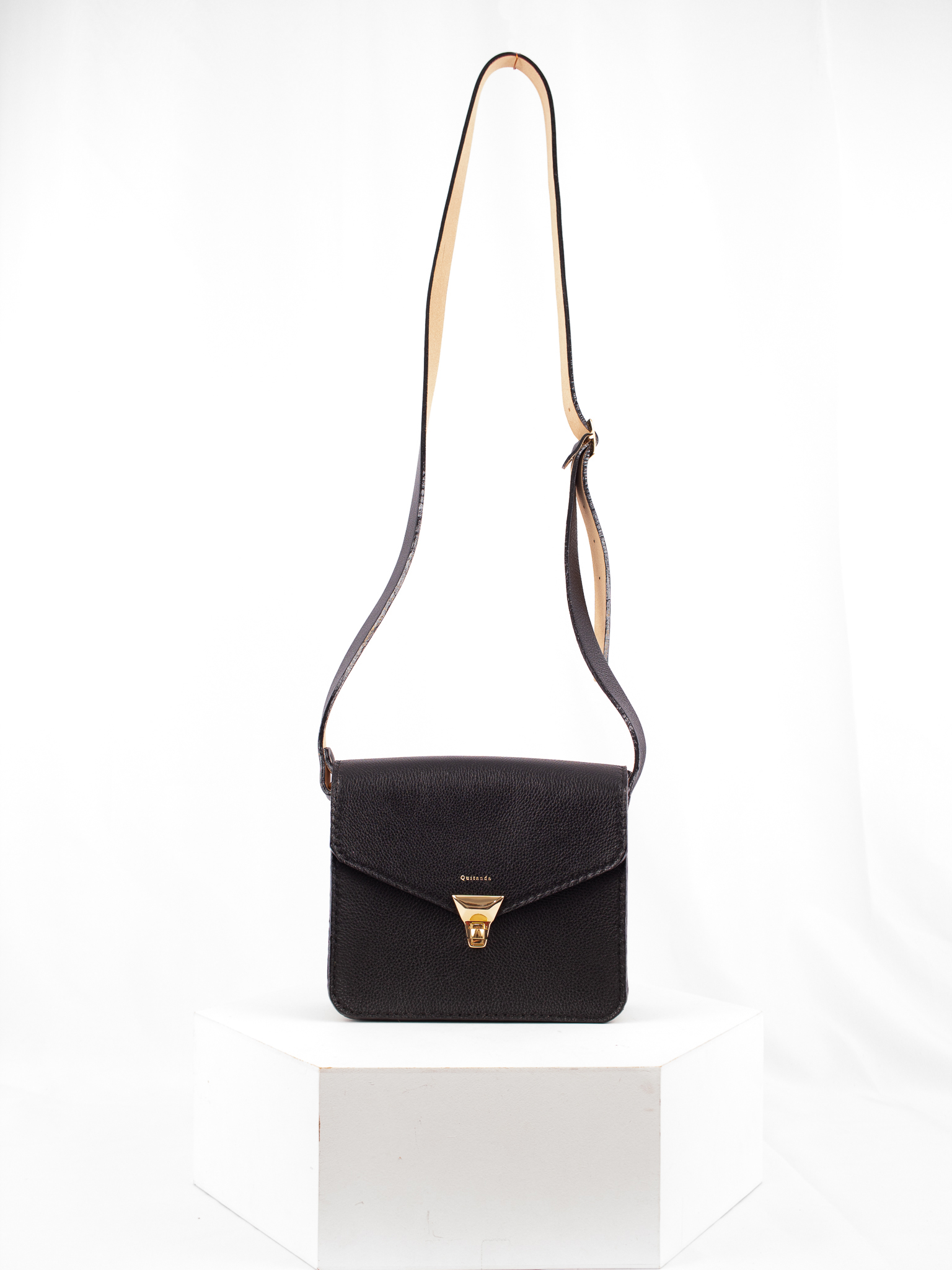 Bolsa de Couro tipo Vaqueta Travel na cor preta com forro em Pelica Cabra, toda feita à mão (assim como todos os produtos Quitanda) Uma bolsa coringa, para você usar no dia a dia, eventos, festas e passeio! Modelagem firme e estruturada, no formato clássico box. Alça longa de couro fixa com regulagem de altura pela fivela. Fecho torniquete.