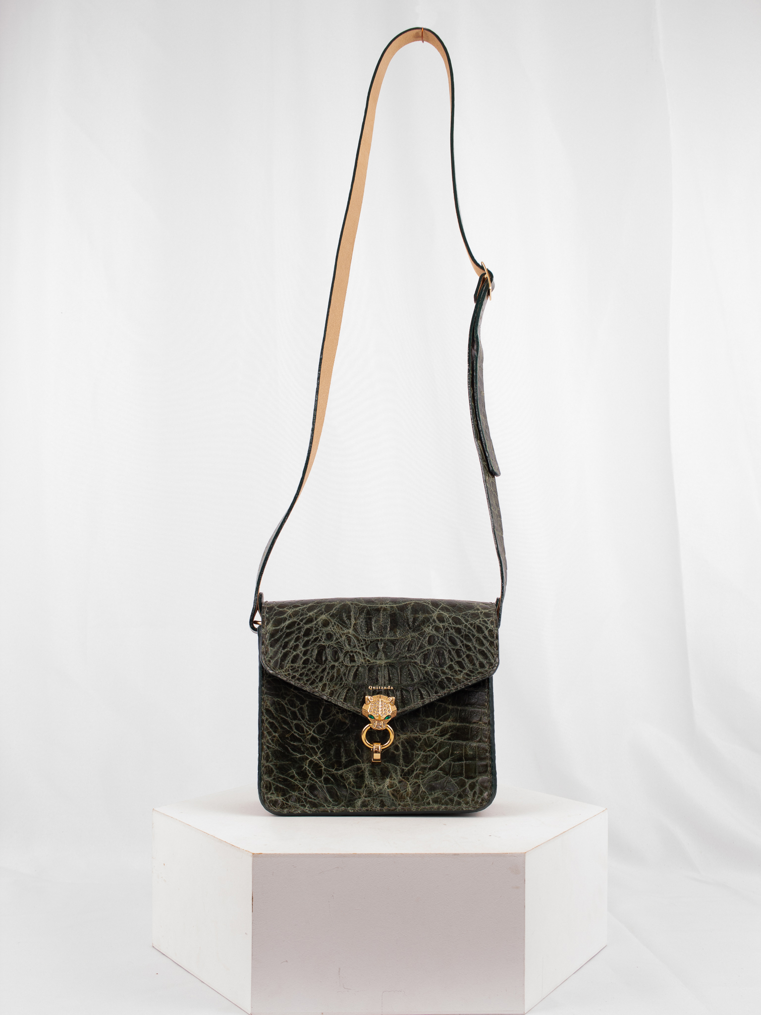 Bolsa de Couro tipo Vaqueta Textura na cor verde com forro em Pelica Cabra, toda feita à mão (assim como todos os produtos Quitanda) Uma bolsa coringa, para você usar no dia a dia, eventos, festas e passeio! Modelagem firme e estruturada, no formato clássico box. Alça longa de couro fixa com regulagem de altura pela fivela. Fecho torniquete enfeite Tigre.