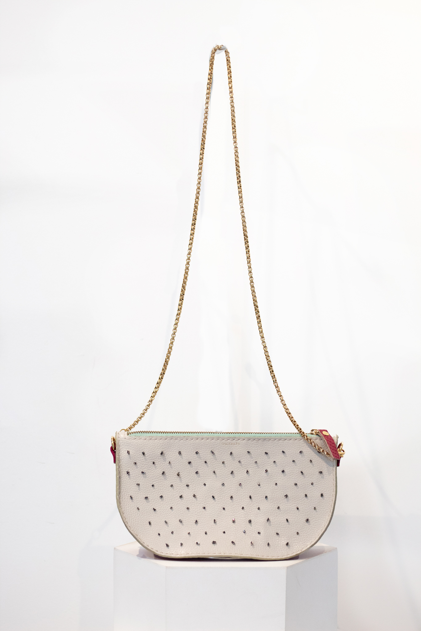 Uma Bolsa em formato de fatia de Pitaya? De uma forma sutil, temos! Uma peça exclusiva feita à mão e com bordado manual também! Miçangas fazem alusão às sementes da fruta, um couro pink com textura lembra a casca e o couro floatter no delicado off white nos lembra do miolo da fruta! Alça em corrente que pode ser utilizada em duas alturas ou ainda removida! Uma escolha inusitada e criativa para quem tem muito estilo e gosta de se divertir com a moda!