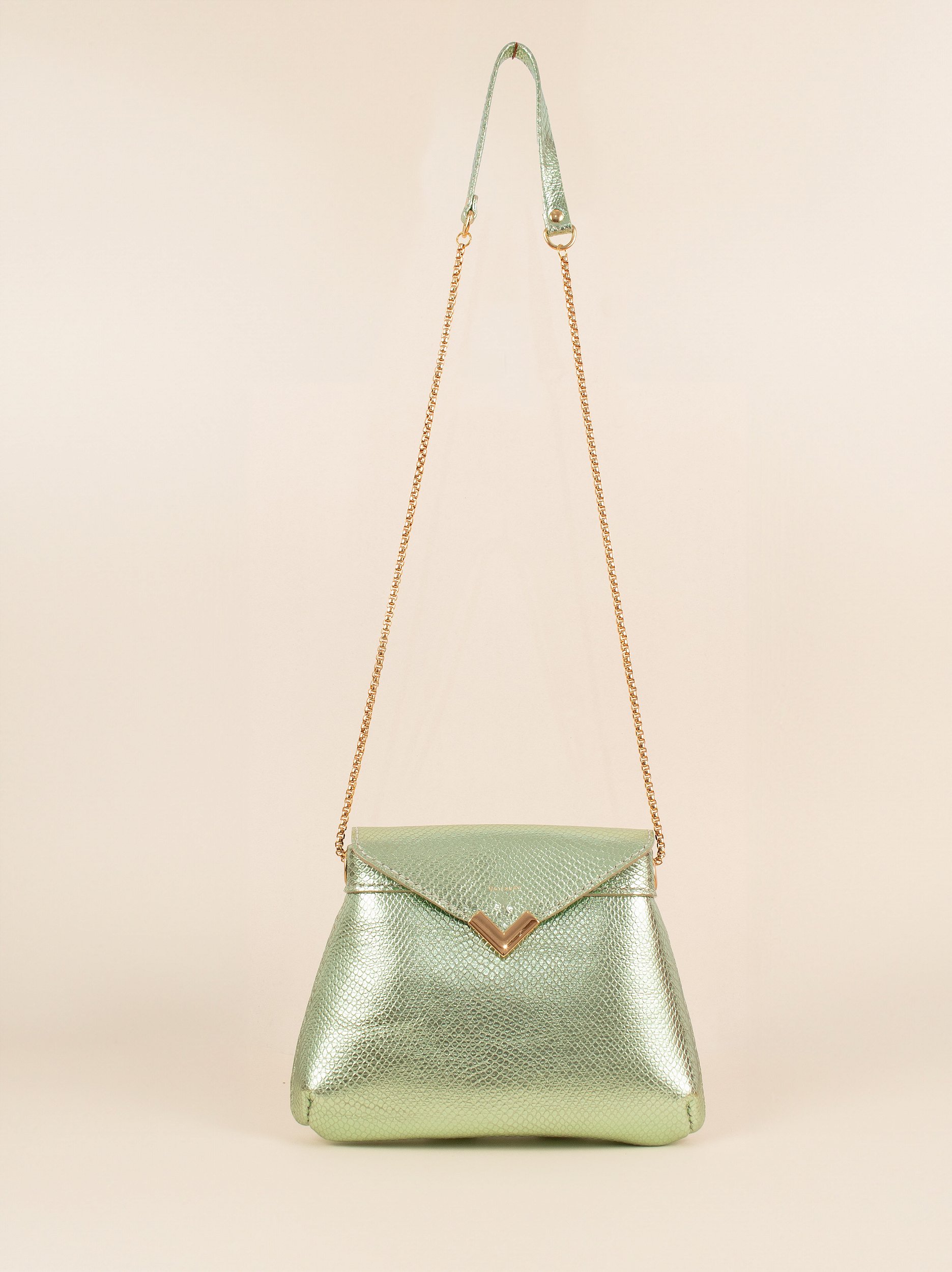 Bolsa Júlia: Jovem, Divertida, Prática e Estilosa! Um tamanho que cabe seu celular, carteira, e outras coisas mais. Bolsa de Couro Metalizado, toda feita à mão (assim como todos os produtos Quitanda!). A estrutura é firme, porém com toque macio! Possui forro de couro fino tipo pelica de cabra. Fecho com aba e botão magnético. Alça tiracolo de corrente que você consegue regular para alça curta de ombro também!