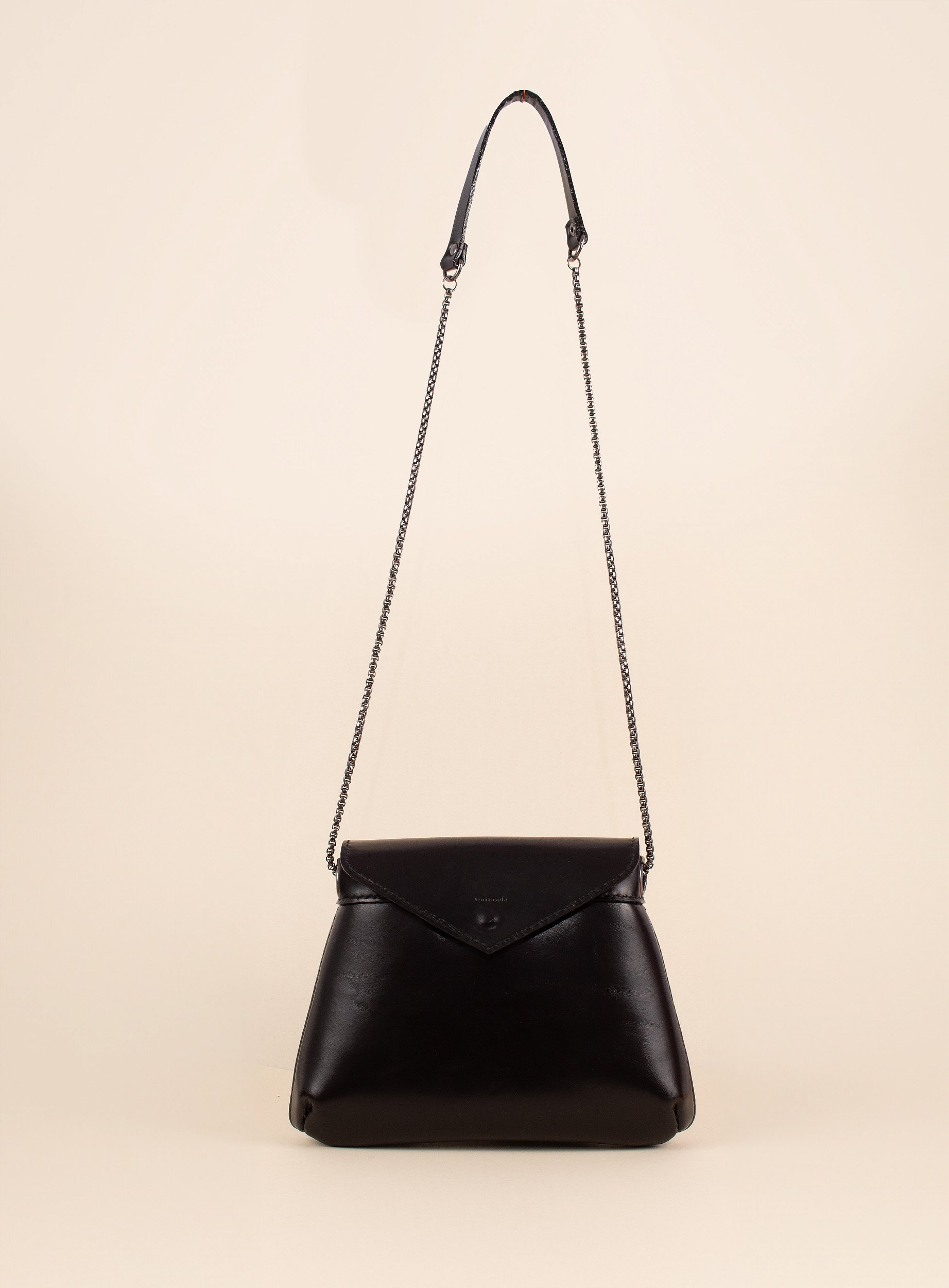 Bolsa Júlia: Jovem, Divertida, Prática e Estilosa! Um tamanho que cabe seu celular, carteira, e outras coisas mais. Bolsa de Couro Firenze Preto, toda feita à mão (assim como todos os produtos Quitanda!). A estrutura é firme, porém com toque macio! Possui forro de couro fino. Fecho com aba e botão magnético. Alça tiracolo de corrente que você consegue regular para alça curta de ombro também! Uma versão mais clean, sem a ponteira de metal na aba.