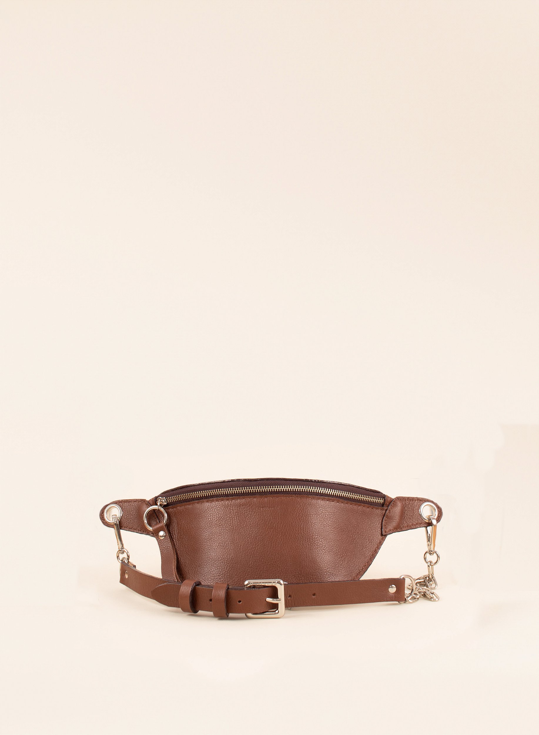 Essa é para quem quer praticidade e estilo na mesma peça! Feita em Couro Travel Marrom Tabaco e forrada com couro pelica de cabra. Possui um único compartimento principal com fechamento de zíper. A alça pode ser utilizada como cinto na cintura e também como alça curta ou transversal. Pode ser regulada tanto na fivela (no cinto de couro) quanto na corrente. Uma peça para ter total liberdade de movimento e ter acesso aos seus pertences de forma rápida e segura.